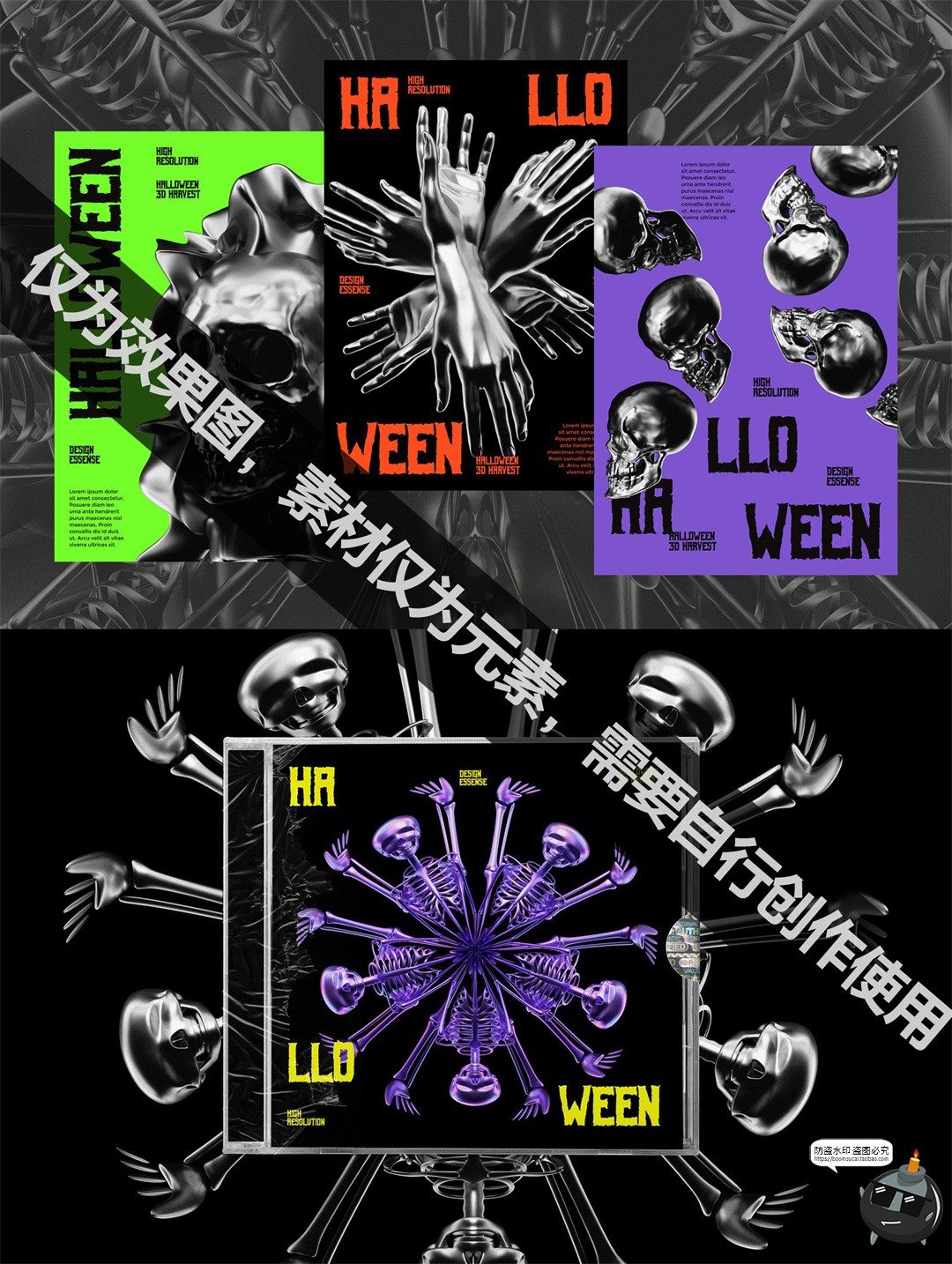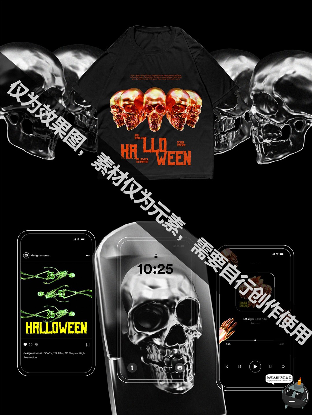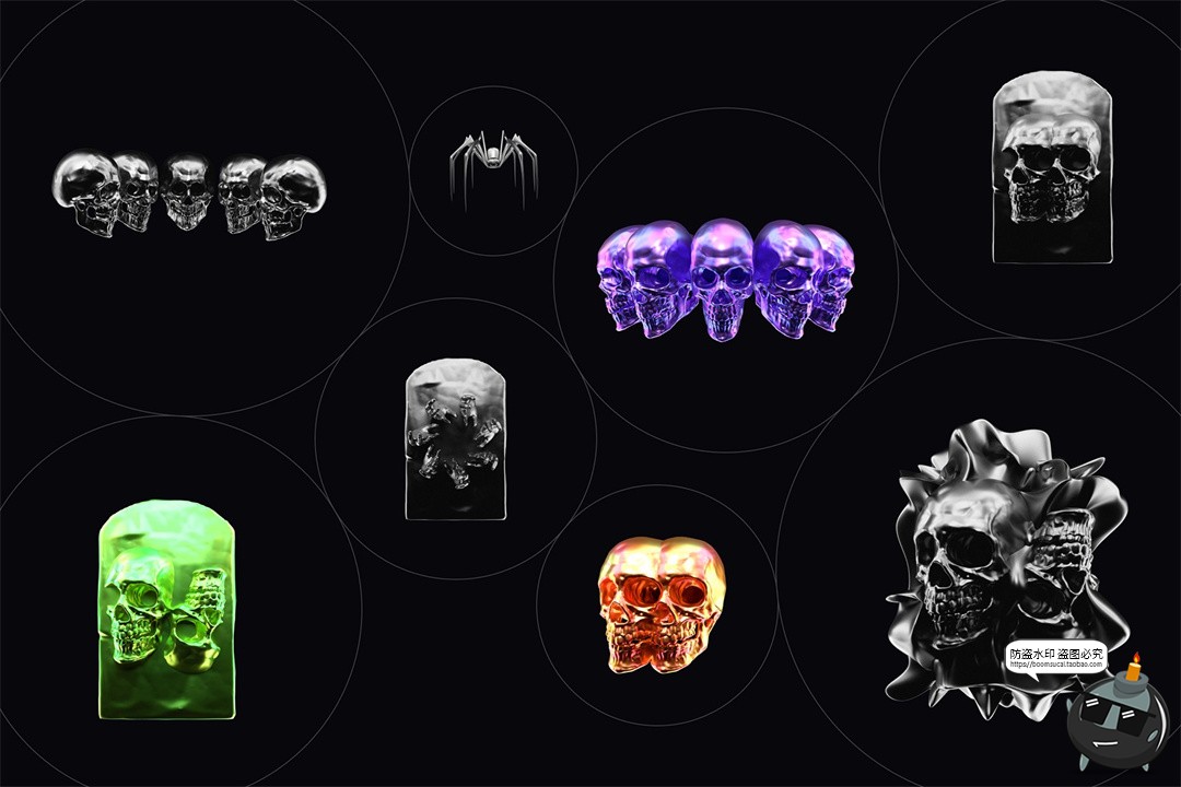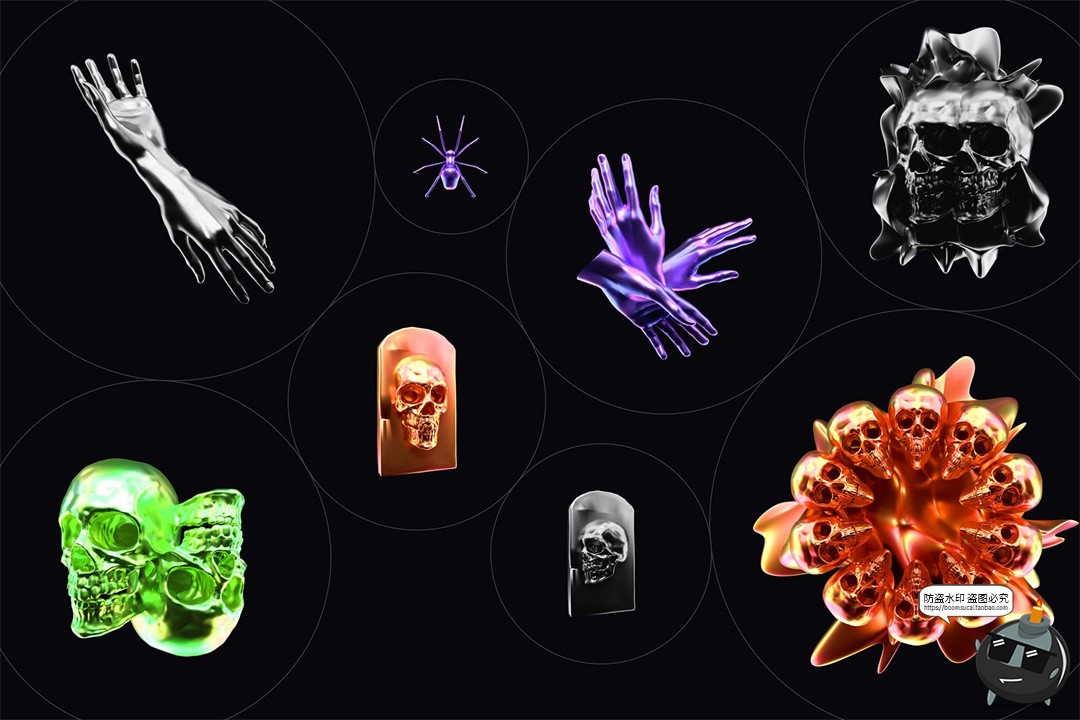 创意潮流酸性3D金属骷髅万圣节氛围海报封面装饰元素PNG免抠素材