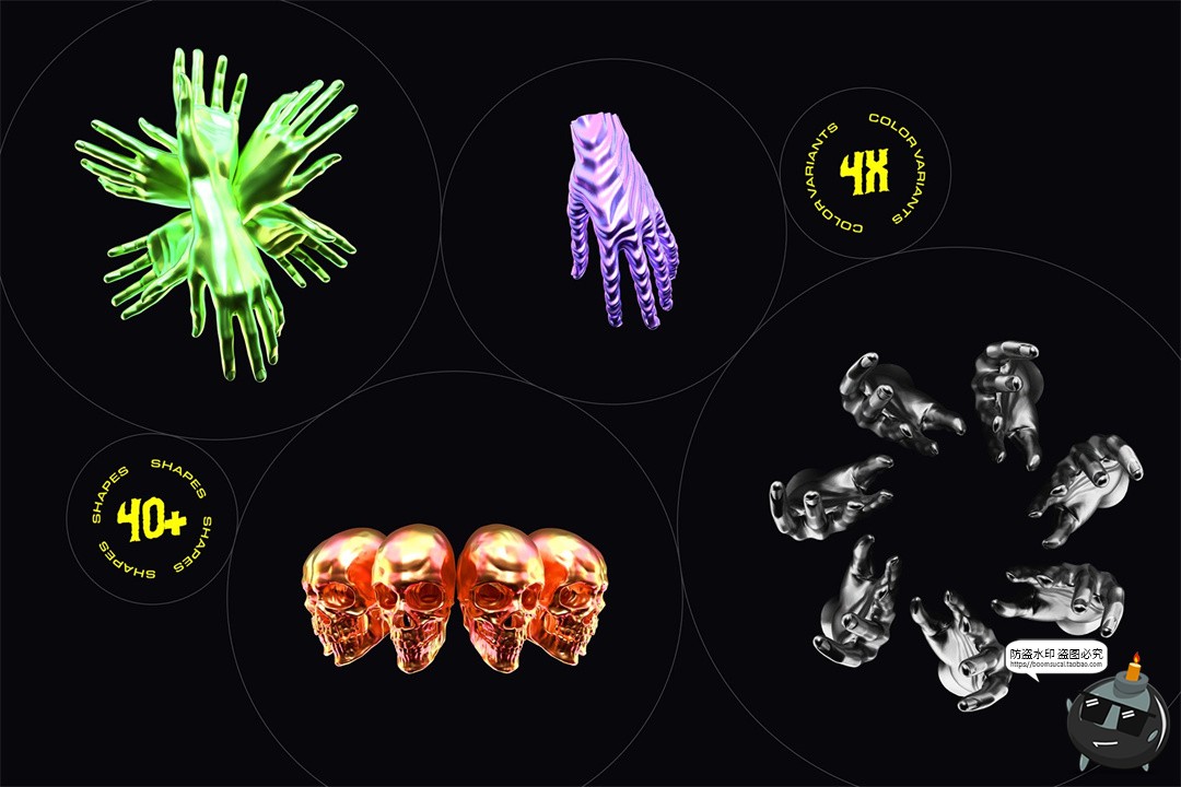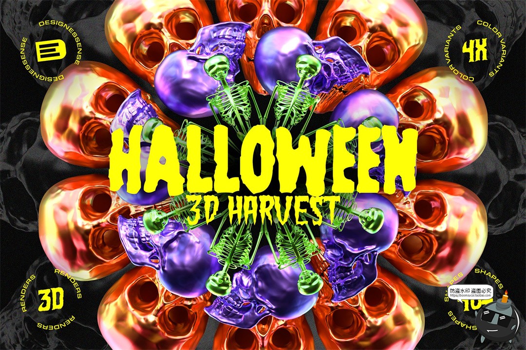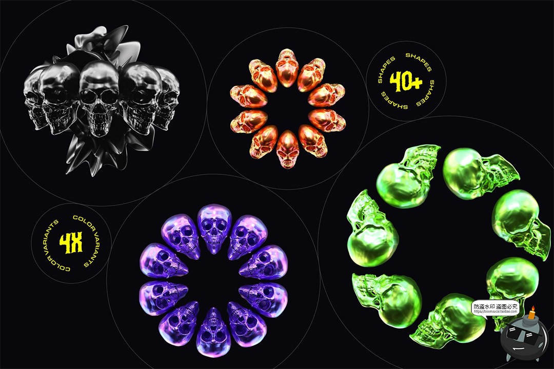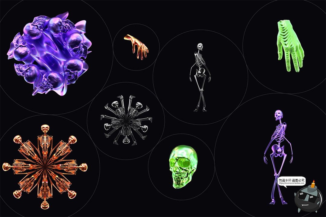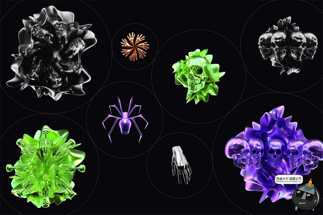 创意潮流酸性3D金属骷髅万圣节氛围海报封面装饰元素PNG免抠素材